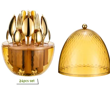 • - الطقم مكون من 24 قطعة (6 ملاعق كبيرة - 6 شوكة كبيرة - 6 ملعقة صغيرة - 6 سكينة) • - ستاند معالق وشوك وسكاكين شكل البيضة. • - مزودة بمقبض مريح يوفر قبضة محكمة أثناء الاستخدام. • - سهولة التنظيف والصيانة، يمكن غسلها يدويًا أو في غسالة الصحون. • - تناسب جميع المناسبات والاحتفالات، سواء في المنزل أو في الفعاليات الخارجية. • - مصنوعة من مواد آمنة وعالية الجودة. • - تصميم عصري وأنيق يضيف لمسة جمالية إلى المائدة. • - ملاعق متعددة الأحجام تلبي احتياجاتك في تناول الطعام. •