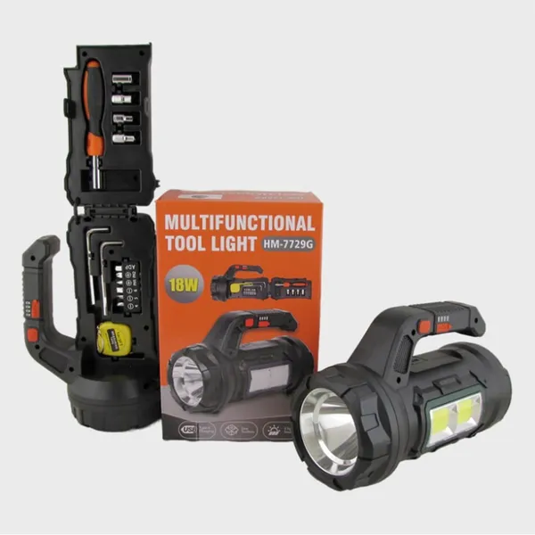 • المميزات: • كشاف قوي مزود بمصباح T6 LED يعطي إضاءة تصل إلى 480 لومن. • يحتوي على إضاءة COB واسعة تغطي مساحة كبيرة، مثالية للعمل والأنشطة الخارجية. • وضع إنذار طوارئ بأضواء حمراء وزرقاء للسلامة والإشارات. • مزود بمجموعة أدوات متكاملة تشمل مفكات، رؤوس متعددة، وأدوات إصلاح. • قابل للشحن بسهولة عبر منفذ USB Type-C، ما يضمن جاهزيته دائمًا. • مصنوع من خامة ABS عالية الجودة ومقاوم للماء بمعيار IP44. • بطارية قوية 3.7V بسعة 2400mAh تعطيك وقت تشغيل من 5 إلى 10 ساعات. • مدة شحن سريعة تتراوح بين ساعتين إلى ثلاث ساعات. • تصميم عملي وقوي يتحمل مختلف الظروف الجوية. • مناسب للاستخدام في المنزل، الرحلات، أو في حالات الطوارئ. • تفاصيل سريعة: • اسم الماركة: CreaTeck • مدة الضمان: 14 يوم • وكيل الضمان: دوزن • اللون: أسود وأصفر(عشوائي) • الوزن: حوالي 990 جرام • الأبعاد: 21.5 × 10 × 14.2 سم • الخامة: ABS مقاومة للصدمات • طريقة التركيب: جاهز للاستخدام مباشرة • المدخل: USB Type-C • السعة: بطارية ليثيوم 2400mAh • الطاقة: 18W • الفولت: 3.7V • الأمبير: 2.4 • الموديل: HM-7729G • نوع الزراير: أزرار ضغط • بلد الصنع: الصين • محتويات العبوة: • 1 x كشاف LED متعدد الوظائف بقوة 18W • x1 مفكات متنوعة • 1 x رؤوس دقيقة • 1 x شريط قياس • 1 x مفاتيح ألين • 1 x كابل شحن USB Type-C • x1دليل الاستخدام