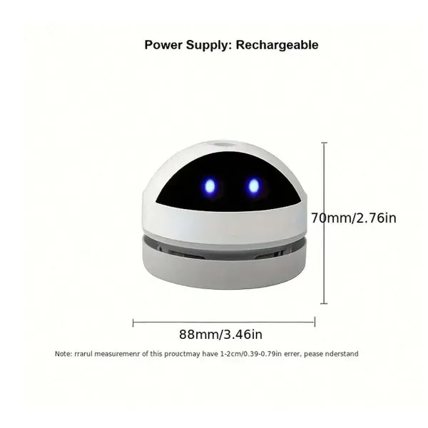 المميزات: تصميم صغير على شكل روبوت يفتح النفس. يشفط الغبار، الفتات، شعر الحيوانات بكل سهولة. يشتغل بالبطارية ويكفيك حتى 3-4 ساعات. يشحن عن طريق USB، تشبكه بأي مصدر طاقة. صوت هادي جدًا، ما يزعج أبدًا وأنت تشتغل أو تذاكر. فيه فوهة قابلة للفصل توصل للزوايا الضيقة. زر واحد للتشغيل – سهل الاستخدام حتى للأطفال. فيه مصابيح LED تشتغل وقت التشغيل وتعطي شكل جذاب. ينفع للمكتب، السيارة، الكيبورد، والطاولات. ـــــــــــــــــــــــــــــــــــــــــــــــــــــــــــــــــــــــــــــــــــــــــــــــــــــــــــــــــــــــــــــــــــــــــــــــــــــــــــ تفاصيل سريعة: الماركة: جينريك الضمان: 7 يوم وكيل الضمان: دوزن اللون: ثلجي الخامة: بلاستيك الموديل: روبوتيك الجهد الكهربائي: 5 فولت الطاقة: 3 واط البطارية: 1200mAh (تدوم 3-4 ساعات) مستوى الضوضاء: 10 ديسبل الحجم: 8 × 8 × 8 سم الوزن: 200 جرام