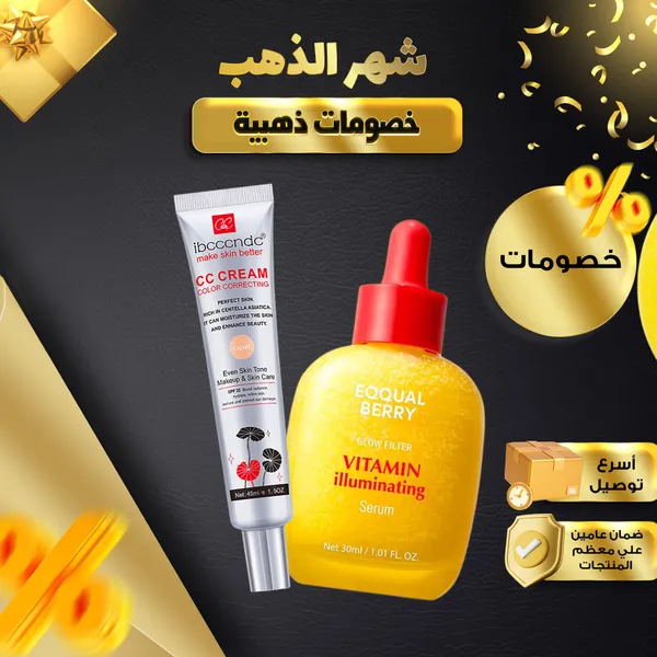 المميزات: يغطي العيوب ويوحد لون البشرة بشكل طبيعي يرطب البشرة بعمق ويصل للطبقات الداخلية يهديء البشرة الحساسة ويقلل التهيج يحمي من الشمس بفعالية SPF 25 ينور ويوحد لون البشرة ويقلل البقع الداكنة يعمل كبرايمر قبل المكياج لتثبيت أفضل وطلة ناعمة مقاوم للماء والتعرق وثبات حتى 24 ساعة غني بالفيتامينات والسيراميد ليقوي حاجز البشرة ويحافظ على نضارتها خالٍ من البارابين والكحول والسيليكون والزيوت المعدنية تركيبته خفيفة تمتص بسرعة بدون لزوجة ومناسب لكل أنواع البشرة ـــــــــــــــــــــــــــــــــــــــــــــــــــــــــــــــــــــــــــــــــــــــــــــــــــــــــــــــــــــــــــــــــــــــــــــــــــــــــــ تفاصيل سريعة: كريم CC بخلاصة سنتيلا 45 مل النوع كريم أساس وكونسيلر CC اللون داكن Dark الحجم 45 مل الحماية SPF 25 مدة الصلاحية 3 أعوام نوع البشرة لجميع أنواع البشرة ـــــــــــــــــــــــــــــــــــــــــــــــــــــــــــــــــــــــــــــــــــــــــــــــــــــــــــــــــــــــــــــــــــــــــــــــــــــــــــ سيروم التفتيح والترطيب الكوري 30 مل النوع سيروم لتفتيح وترطيب الوجه المكونات فيتامين سي نياسيناميد سيراميد خلاصة الكرز مناسب لكل أنواع البشرة بلد المنشأ كوريا الجنوبية مدة الصلاحية 3 سنوات ـــــــــــــــــــــــــــــــــــــــــــــــــــــــــــــــــــــــــــــــــــــــــــــــــــــــــــــــــــــــــــــــــــــــــــــــــــــــــــ محتويات العرض 1 × كريم CC بخلاصة سنتيلا 45 مل 1 × سيروم كوري لتفتيح وترطيب البشرة 30 مل ـــــــــــــــــــــــــــــــــــــــــــــــــــــــــــــــــــــــــــــــــــــــــــــــــــــــــــــــــــــــــــــــــــــــــــــــــــــــــــ طريقة الاستخدام نظف وجهك كويس قبل الاستخدام ابدأ بكريم CC لتغطية العيوب وتوحيد لون البشرة وحماية من الشمس بعده استخدمي السيروم بلطف على الوجه وربتي عليه عشان يمتص تمام استخدمي السيروم صباح ومساء قبل المرطب احفظي المنتجات بعيد عن الضوء المباشر